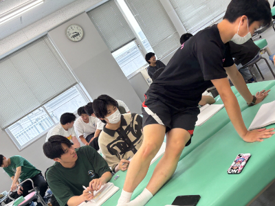 この講義では、「背臥位から長坐位」と「長坐位から膝立ち」の分析を演習しています。クラスメイトの生の動作を観察し、関節運動の記載と筋活動の推察をしていきます。細かくどのような関節運動によって動作が成り立っているのかを見つけていくのも難しいのですが、その関節運動を行うのにどのような筋活動が生じているのかを考えていくことはもっと難しいです。ただ、この難しさがあってこそ、わかるようになると楽しいようです。