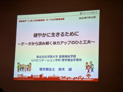東松島市社会福祉協議会が主催する「いきいき百歳体操代表者会議」の中で,「健やかに生きるたにデータから読み解く体力アップのひと工夫~」と題し,本専攻の鈴木誠教授が講演を行いました。