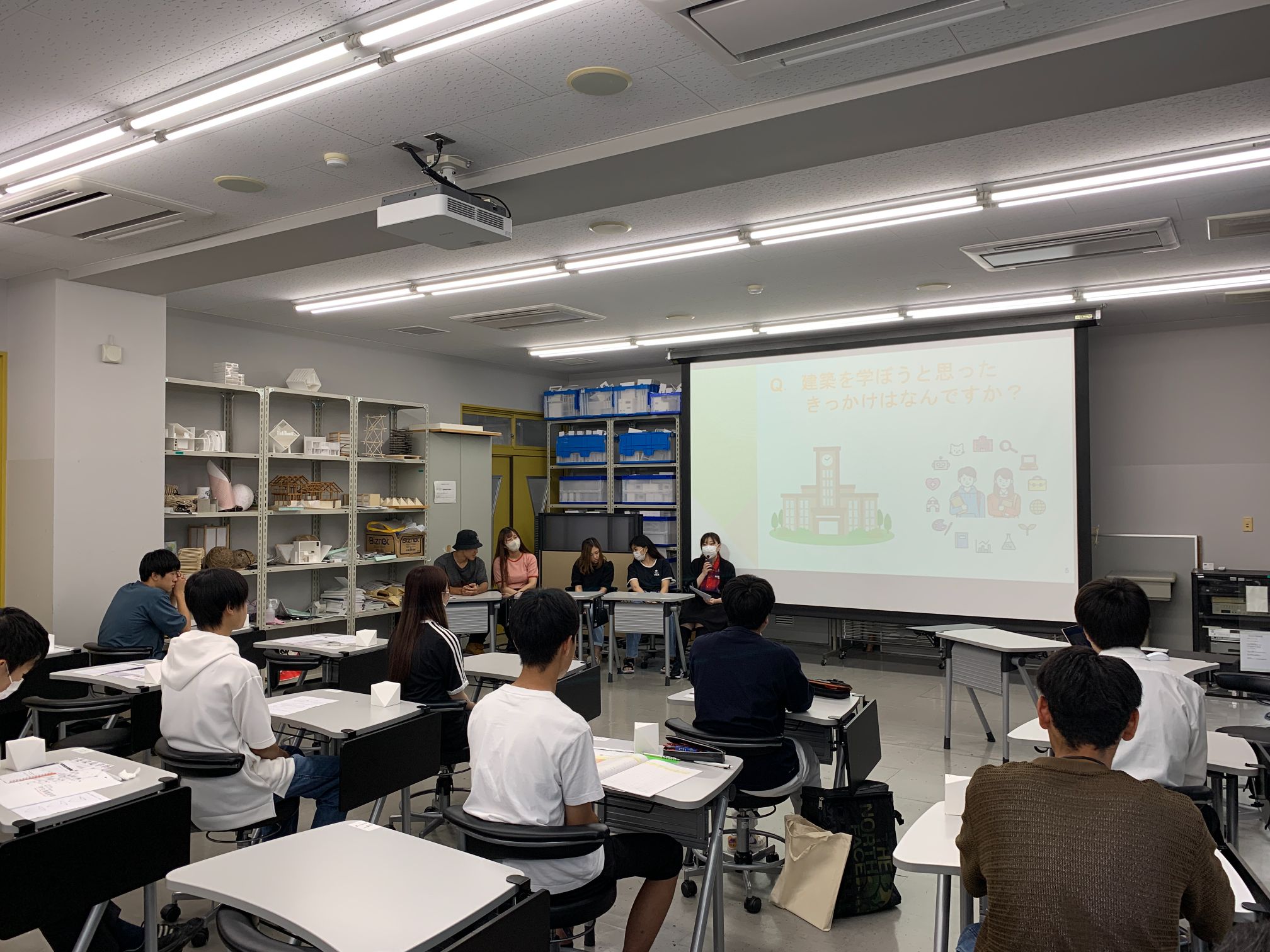 まず、須藤教授から、建築環境学科の概要について説明がありました。建築の仕事の概要、2つのコースと365体育投注、卒業生の進路状況、経済支援、スタッフの紹介がなされました。