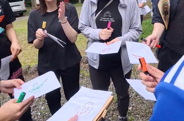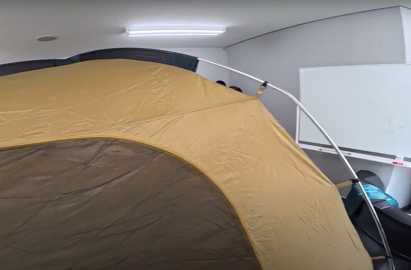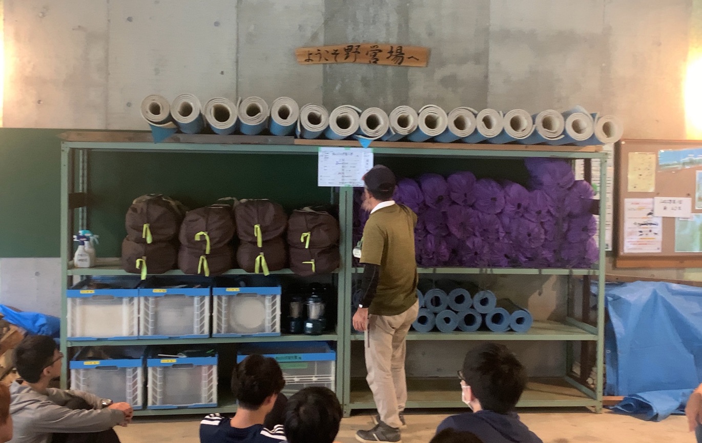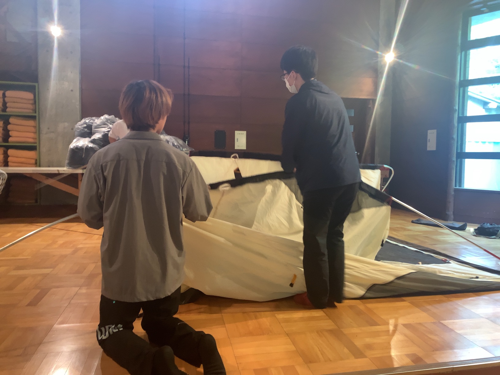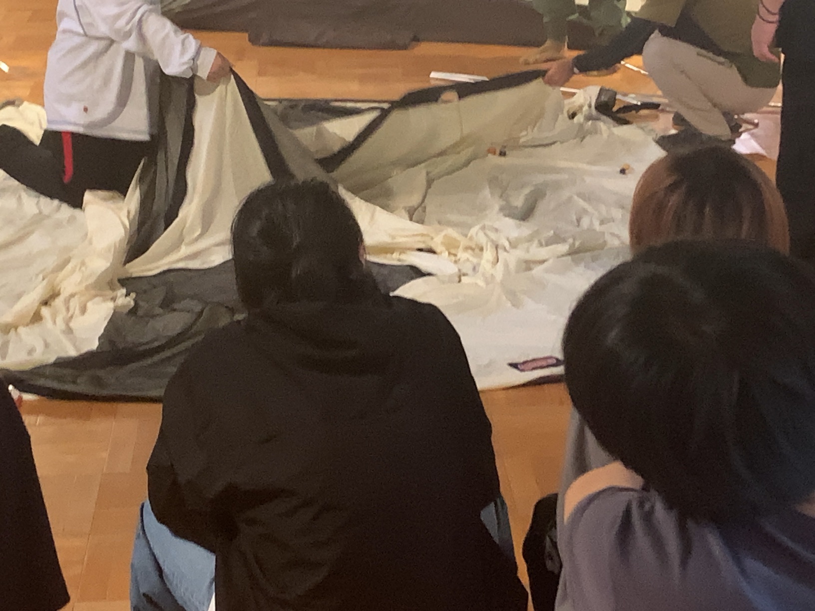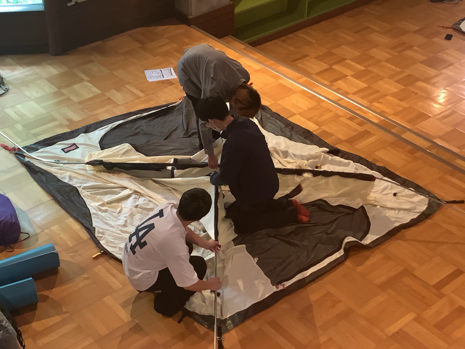 実習前日は、学生リーダーと教員がテント設営の練習や備品準備を行いました。
