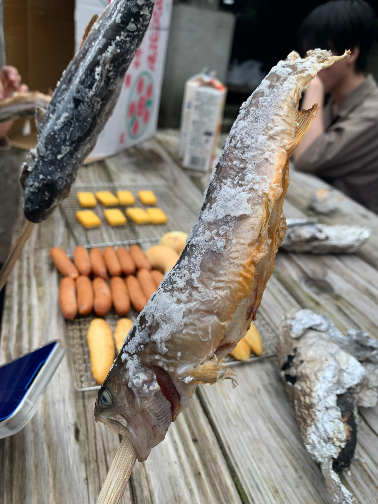 また、沢登りで取った魚を捌き、炭火で焼いていただきました。
