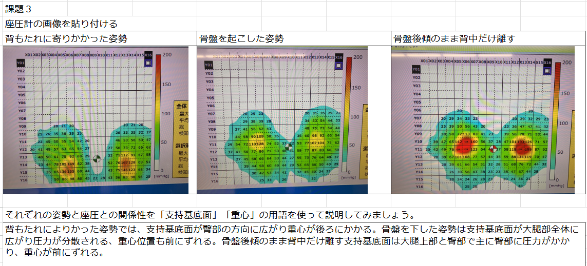 座圧計を使って、姿勢を変えることで支持基底面(体重を支える面積)や重心がどのように変化するかを分析しました。
