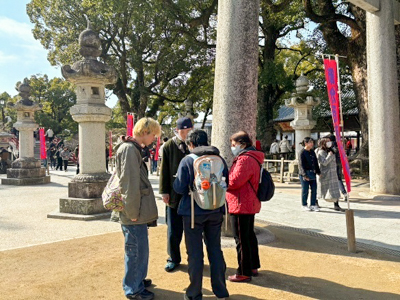 8名のゼミ生はペアを組んで4チームに分かれ、博多駅や太宰府天満宮で積極的に外国人観光客に声を掛けました。しかし、英語話者が多かった京都とは異なり、言語や文化的背景の違いからインタビューを断られることの連続で、時には気持ちが折れそうになる場面もありました。それでも粘り強く挑戦を続けた結果、最終的には約50名の外国人観光客から回答を得ることができ、多様な国の方々と直接交流する貴重な経験をすることができました。