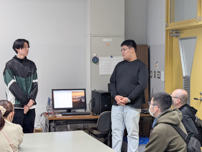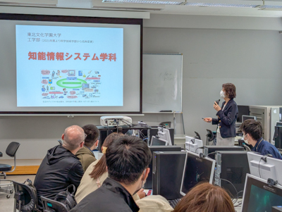 知能情報システム学科のプログラムでは、冒頭に沈学科長より学科の概要と各種入試方式についての説明がありました。続いて行われた学科施設見学?体験学習では、3つの実験室と費准教授の研究室を紹介しました。