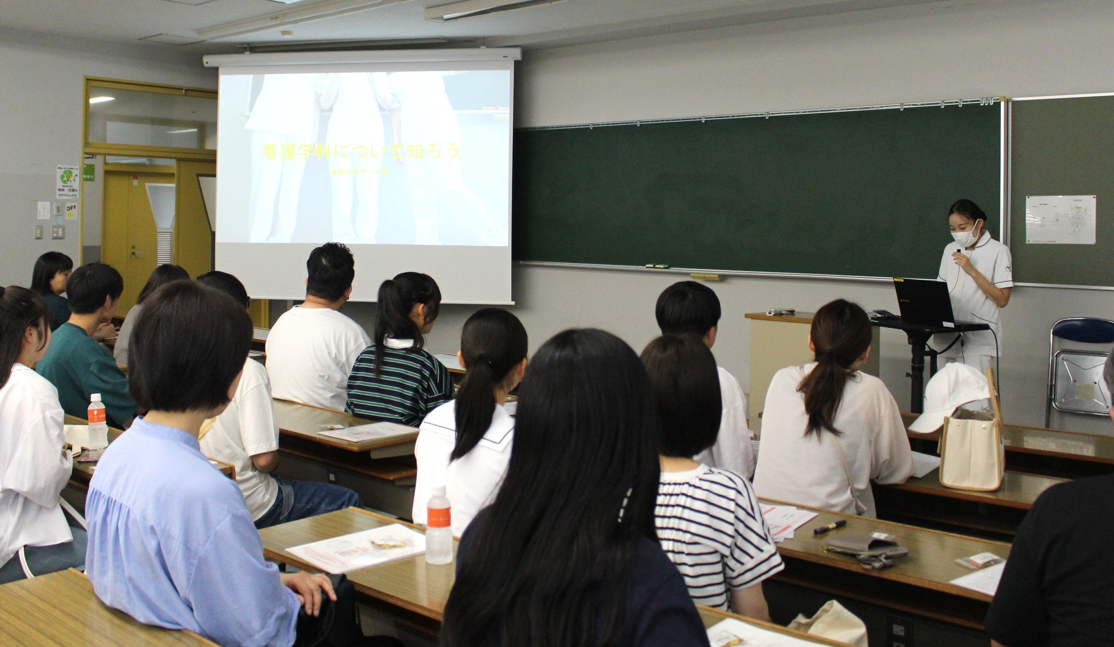 学科紹介では4年生が大学生活についてのプレゼンテーションを行い、