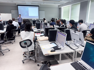 模擬授業「ARゲームを作成しよう」にて、費准教授の講義を聴く参加者と支援学生たち
