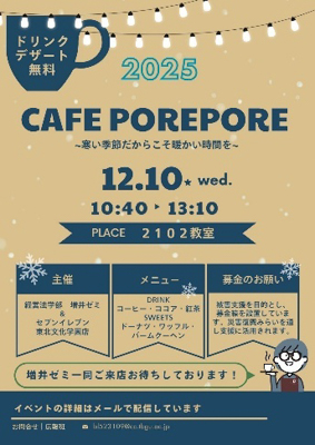 みなさん、こんにちは!「カフェポレポレ」、広報班です。今年も増井ゼミ(2~4年)と本学セブンイレブンの合同企画で、カフェポレポレを開催します。