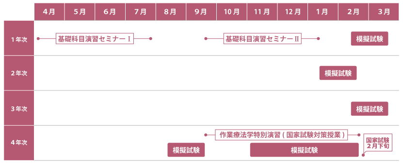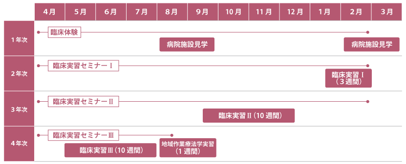 | 臨床実習セミナーⅠ?Ⅱ?Ⅲ | 実習の概要について学びます。臨床実習の前後には、基礎的知識を確認するため共用試験を、技術を確認するため客観的臨床能力試験(OSCE)を実施します。 |
