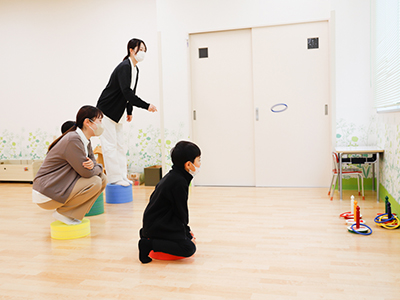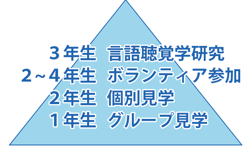| 1年生はゼミで活動する授業の中で国見の杜クリニックの施設内を見学します。2年生では実際の臨床場面を個別に見学します。2年生(後期)から4年生は教員の臨床場面にボランティアで参加しています。3年生になるとボランティア参加のほか、選択必修科目の言語聴覚学研究を履修して小児領域の研究を行う学生もいます。見学、ボランティア参加、研究と学年の進行に応じて学びを深めていくことができます。 |  |