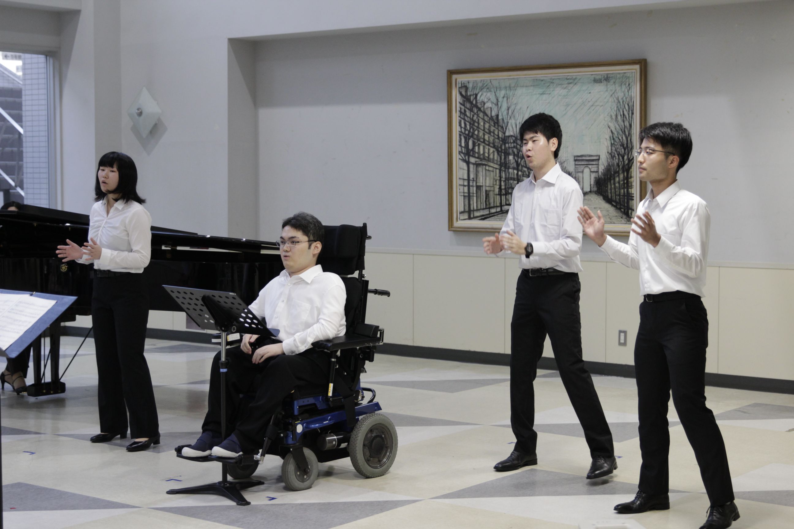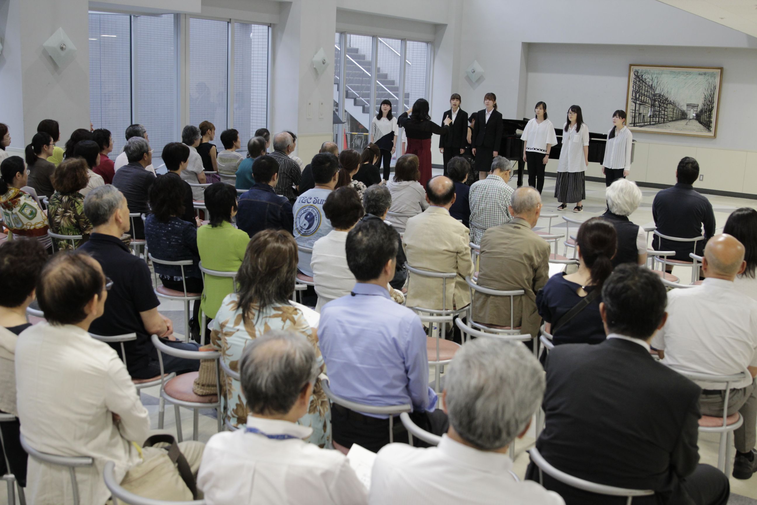 次に、開演に先立ち、本学の有志合唱団が『桜』、『打上げ花火』、『歩いて帰ろう』の3曲を