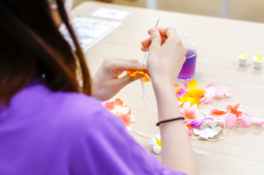 C&C英語講師?ハワイ出身のリアーン先生と英会話を交えながら、一緒に”レイ”作り。