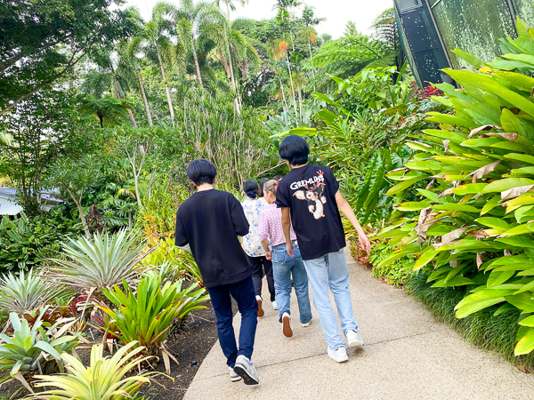 熱帯雨林のケアンズならではのトロピカルな植物たちに学生は長旅の疲れも見せず、