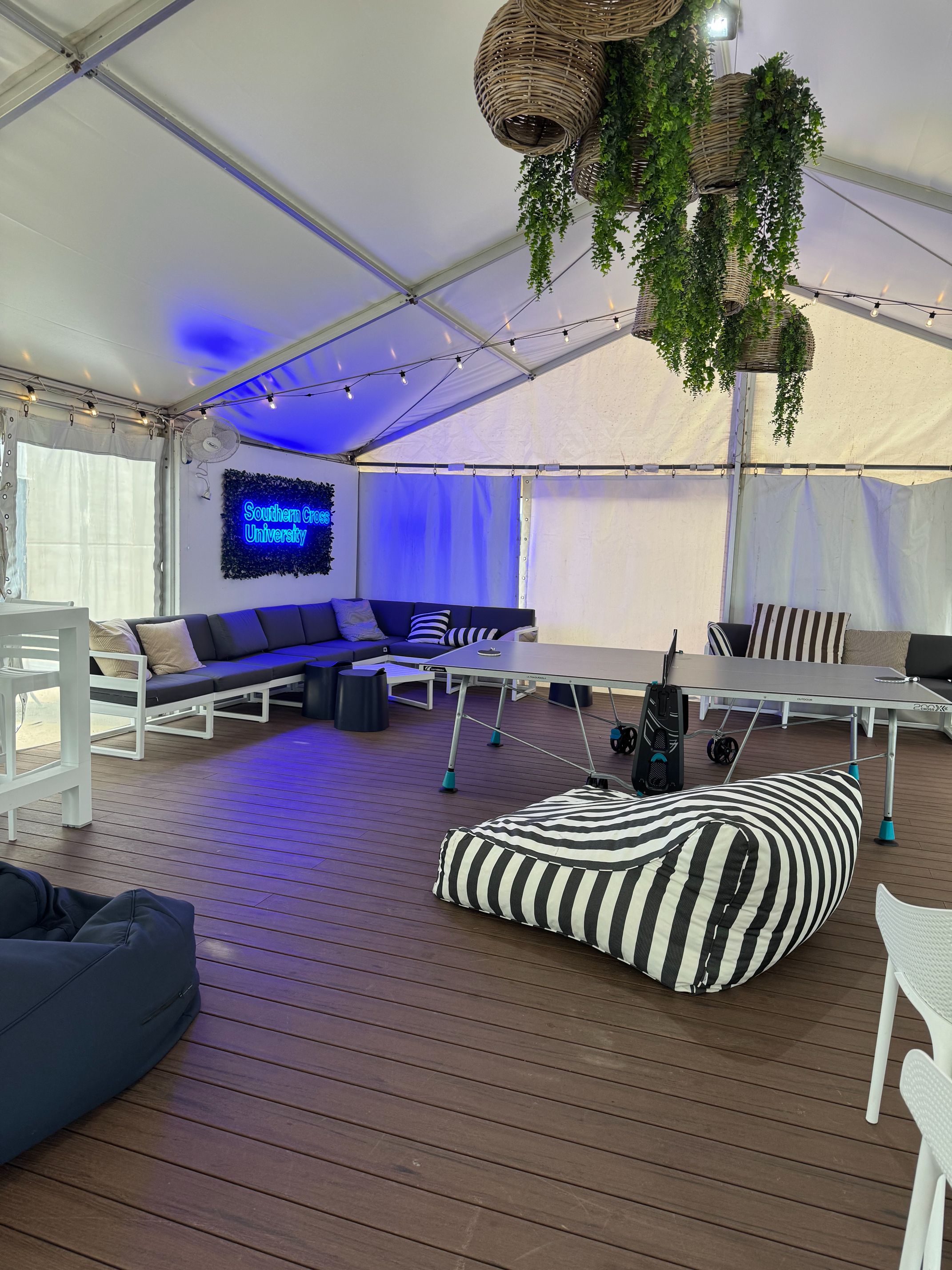 ランチは、外のテントの中にあるソファーに座って話しながら食べました。