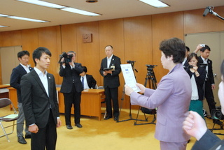 5月9日に支援の対象となる強化指定選手の認定証授与式を開催し、山形県知事から強化指定選手に対して認定証の授与が行われました。