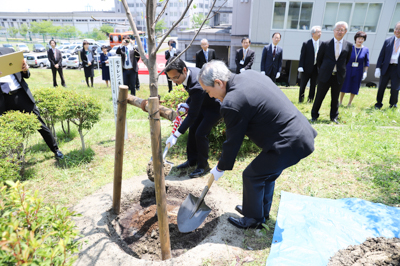 式典に先立ち、大学同窓会からモクレンの寄贈があり、記念植樹が行われました。