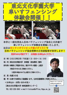 2月17日(金)13:00から、本学体育館を会場に、車いすフェンシング体験会を開催します。
