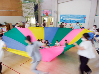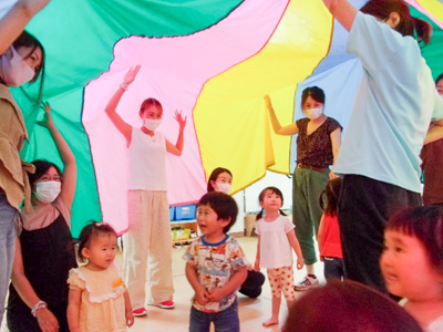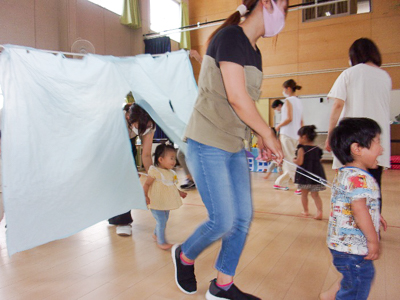 最後はバルーンが登場!お母さん達がヒラヒラさせるカラフルなバルーンに子ども達も興味津々でした。クライマックスはお母さん達が新幹線になって走る走る!!コーヒーカップのようにクルクル回り、初めての感覚に皆喜び!親子共にワクワクした時間となりました。