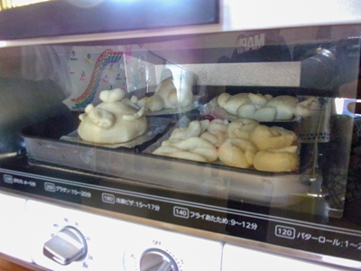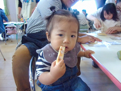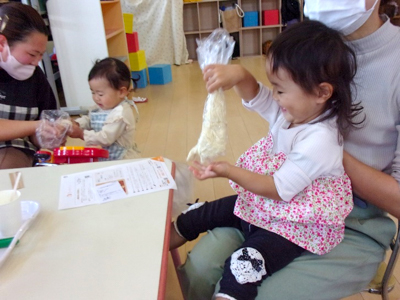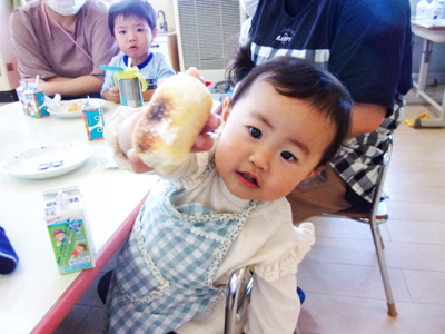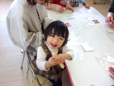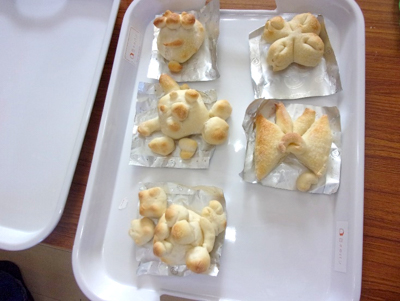 こねこね、もみもみ。三角や丸を組み合わせて作る「つみきパン」で、チョウチョやロケットができました!やっぱりアンパンマンは大人気。焼くと鼻やほっぺがプックリ膨らみ、とてもお茶面なアンパンマンが焼き上がりました!これもまた手作りの楽しさですよね。焼きたてパンを食べて、楽しく幸せな活動となりました。忙しい子育てに追われている大人でも、「達成感」を感じられるのがこのパン作りの魅力のひとつだと先生が仰っていました。