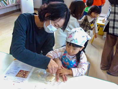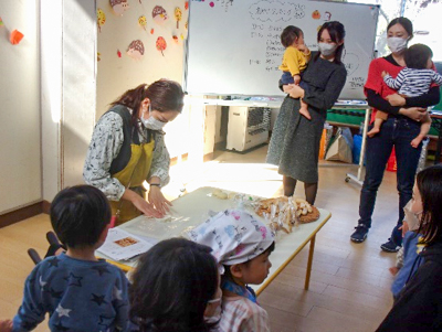 説明を聞く間も、パンの香ばしい香りが広がり、早く食べたい!やってみたい!と子どもたちもすっかり夢中になっていました。