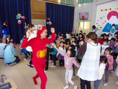 ダルマさんが演じるパネルシアターを見て最後は一緒にダンスを踊り楽しい誕生会を終えました。