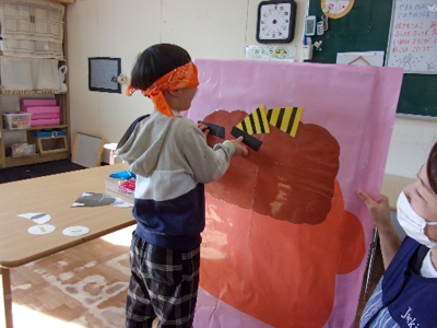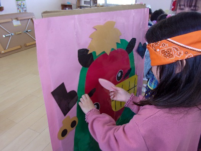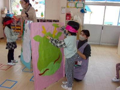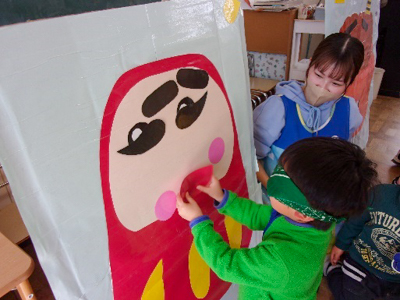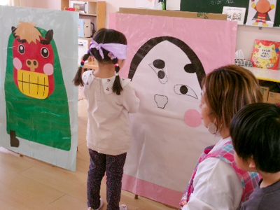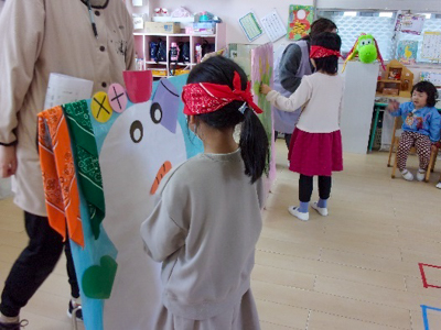 福笑いの定番“ひょっとことおかめ”、お正月にまつわる“獅子舞とだるま”、今年の干支の“辰”、“ゆきだるま”、節分に向けて“鬼”の大型福笑いを楽しみました。目隠しをすることで目の前が見えなくなる感覚を楽しみ、「目はどこかな?」「ここでいいのかな?」と考えながら一生懸命福笑いを完成させていました。目隠しを取った瞬間、声を大にしながら笑い転げる様子があり、周りで応援している子どもたちも一緒になって大笑いしていました?