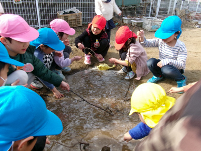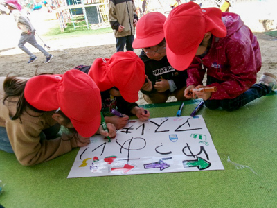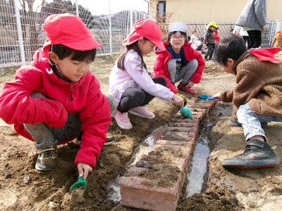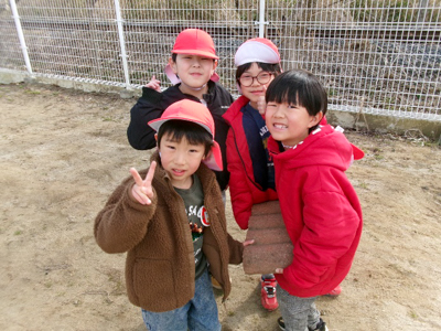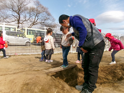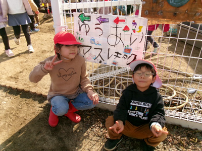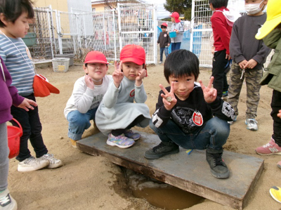 サツマイモを焼くために掘った穴や、その後に穴掘りを楽しんでできた沢山の穴でデコボコしている冬の友愛畑。畑の片隅にあった板を渡してみたら???橋ができた!そんな発見から、翌日には、釣り堀、桜橋、友愛橋、丸太渡りなどなど、おもしろゾーンがたくさん完成したのです!さすが年長さん。看板も登場すると、あっという間にアスレチックはお客さんでいっぱいになりました。