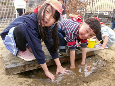 そんな中、またまた、おもしろ素材を見つけた4人組。「もっと掘るんだ!」とスコップを持ってきて、おもしろ橋を作り上げました。アイディア溢れる子どもたち。ゆうあいアスレチックは、まだまだ発展しそうです?