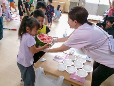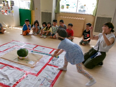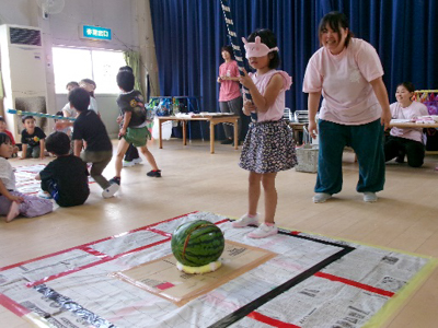 2グループに分かれてすいか割りスタート。『あっ!ヒビがはいった!』の声でみんな近寄って、危ない危ないの合図で離れて…の繰り返しでパカーン!と割れたスイカ。おかわりし放題でみんなお腹タプタプになりました。