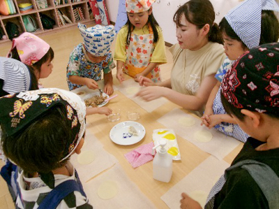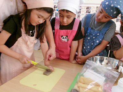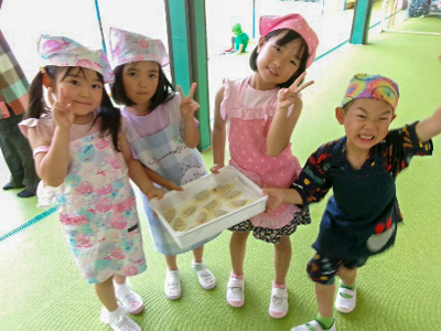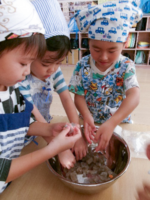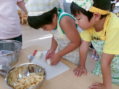 夕食はみんなで食べたいメニューを決めました。みんなで作るのは、豚汁と餃子。わくわくデーで作った豚汁が美味しかったからもう一度!と、リクエスト。さすが年長さん、手先を器用に使い調理できました。