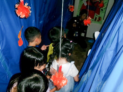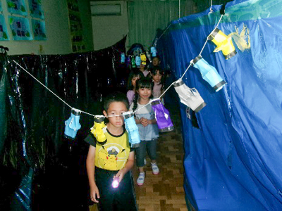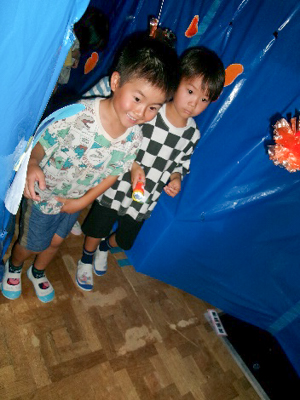 毎年恒例お化け屋敷。今年もお化け作りに挑戦!みんなで作ったお化けあるかな?とドキドキしながら、ゴールを目指しました。