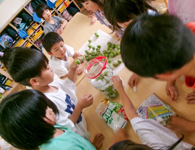 ご飯の中でも、自分で握ったおにぎりがとっても美味しい?中身は友愛初挑戦の手作り梅干しです。とてもすっぱかったね!飲み物もみんなで頑張って作った梅ジュース☆