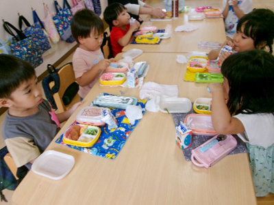 夏休みが明けて久しぶりに畑に行くと、ピーマンが大きくなっていることに気づき、みんなでたくさん収穫しました。年少組の子どもたちと相談し、醤油味と味噌味のピーマン炒めにして食べました!