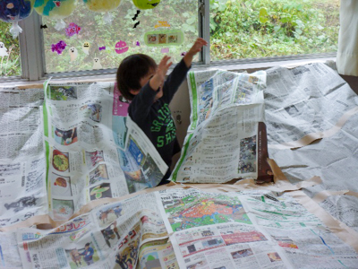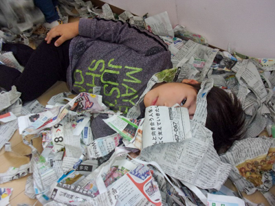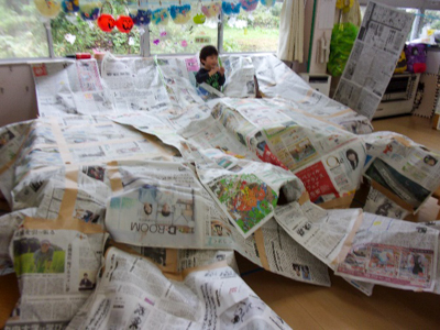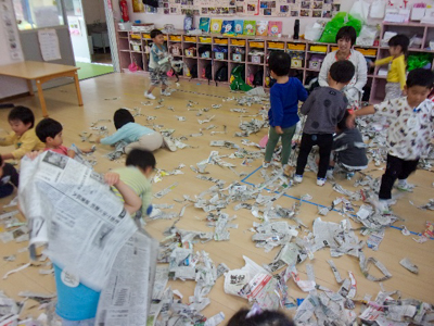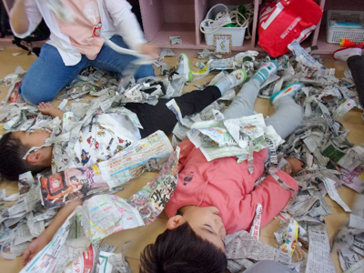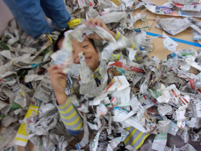両手いっぱいに新聞紙を集めてシャワーにしたり、友達を新聞紙で隠したり、、、、