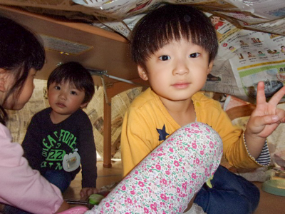 新聞紙を布団に見立てて寝っ転がる子どもたちがとてもかわいかったです?