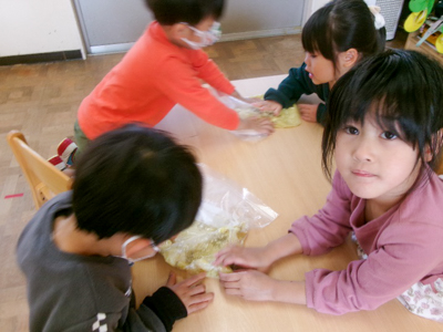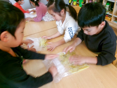 ④袋に入れて、サツマイモを潰しました。2人で協力して潰したから、あっという間にふにゃふにゃに!