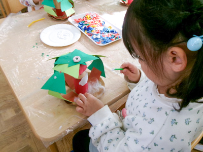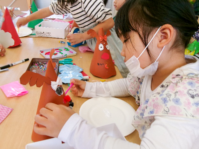 まずはクリスマス製作を作り、トナカイ帽子を被ってパーティー準備です?
