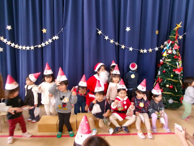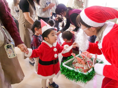 鈴の音と共に、サンタクロースが登場です!みんなの所に届けに行く前に「ちょうだーい!」とサンタさんが囲まれてしまいました。みんなのワクワクが止まらない様子がとても可愛かったです。
