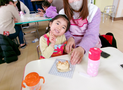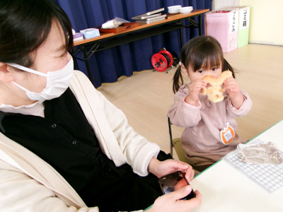 焼きたてパンは香ばしくていい匂い!そして、お母さんと一緒に作ったパンは幸せの味!みんなモグモグが止まりませんでした。