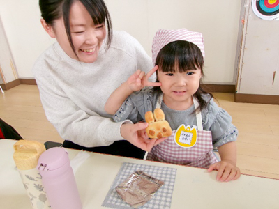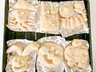 「おいしくなぁれ~」のおまじないをかけながら生地をこねこね。もちもちフワフワの感触にみんな夢中でした。スケッパーでサクッと切って、好きな形を作ってみよう!車、ウサギ、踏切り、ネコなどなど、かわいいパンが完成しました。