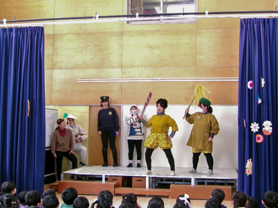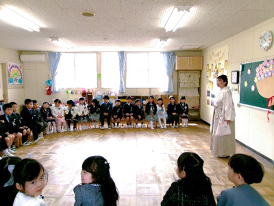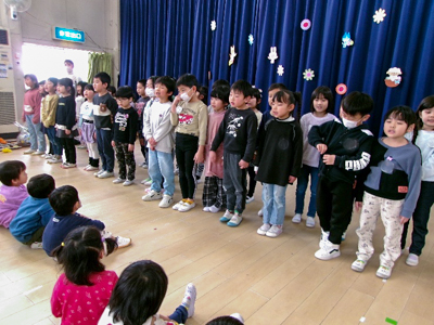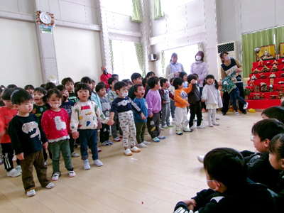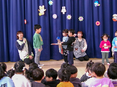 これまで友愛幼稚園のリーダーとして頑張ってくれた年長さんに感謝の気持ちを込めて、お別れ会を行いました。子どもたちからは手作りプレゼントと歌を贈り、先生たちは思い出の曲を交えた劇「ももたろう」を発表しました。年長さんからも素敵な歌を聴かせてもらい、笑いあり感動ありの素敵な時間となりました。