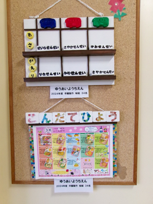 卒園記念制作はバスの先生をお知らせするボードと献立表の掲示板です。みんなのことを思い出しながら、大切に使わせていただきます。ありがとう!