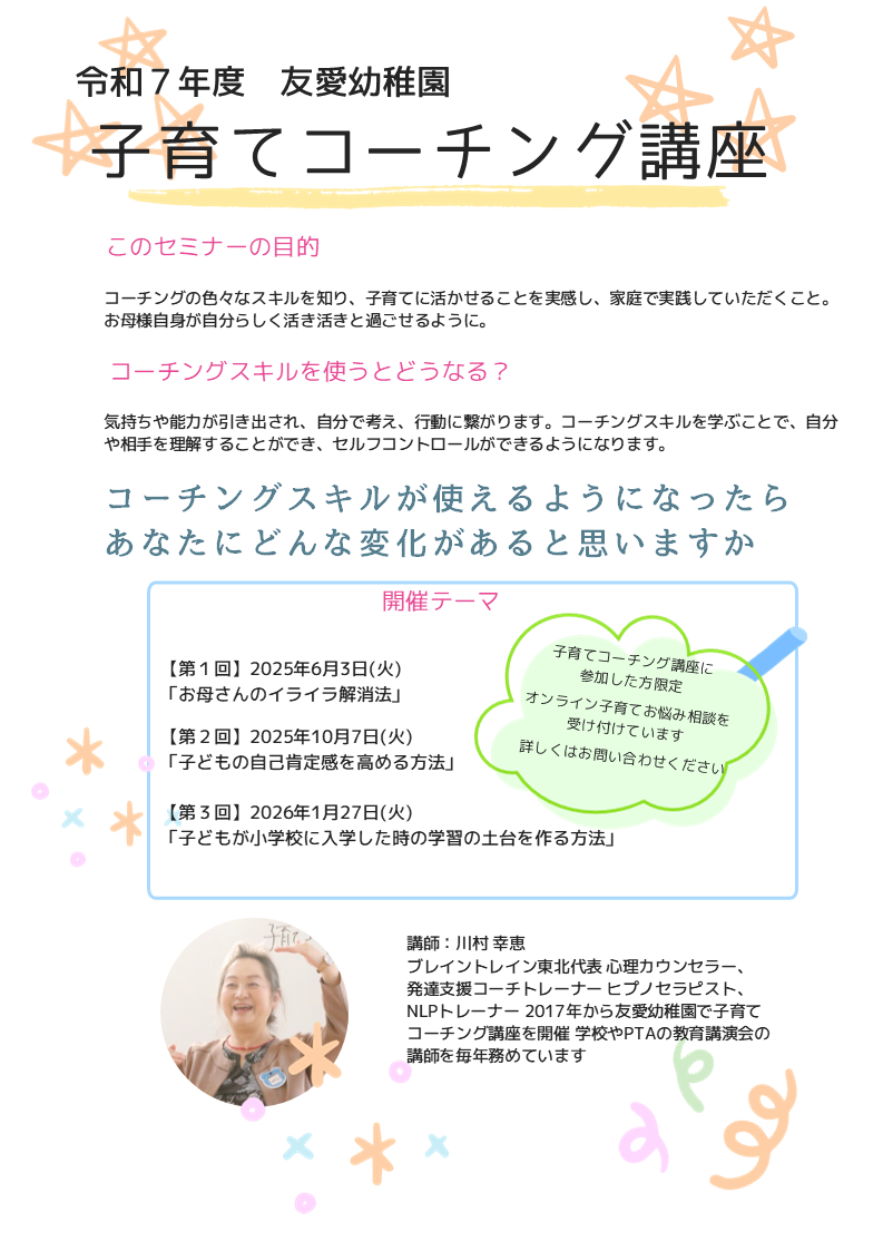 毎年恒例の川村幸恵先生による子育てコーチングを今年も開講します。