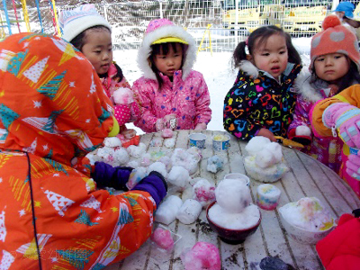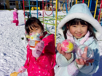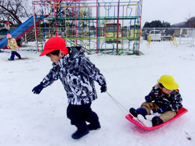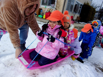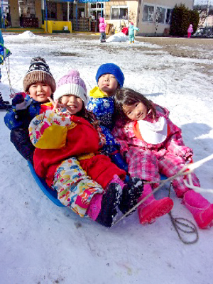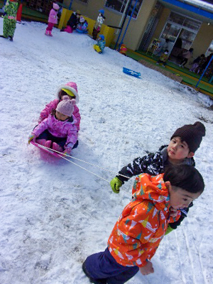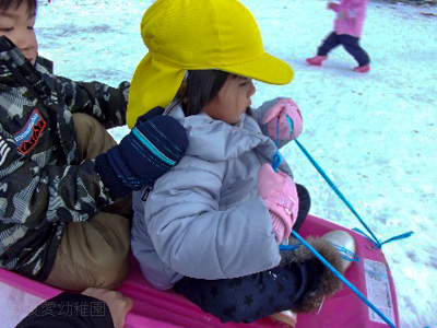 そり滑り台を作ってそり滑りやオリンピック種目のリュージュごっこをしたり、友だち同士でそりを引き合う微笑ましい姿も見られました。
