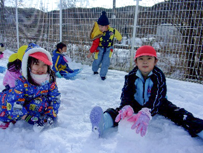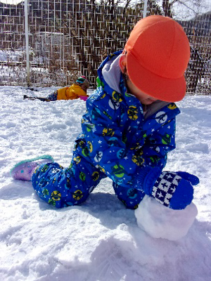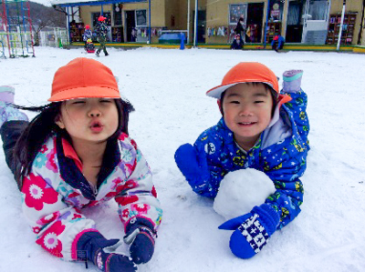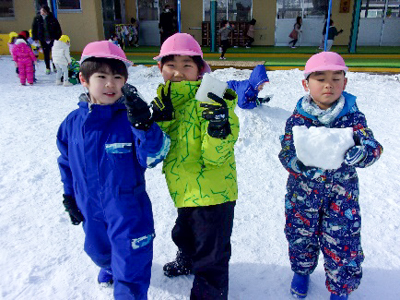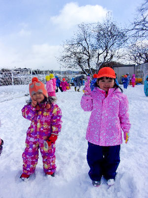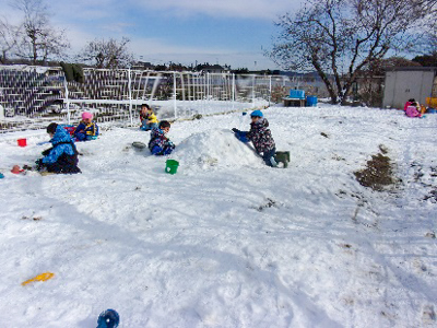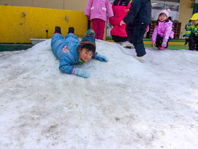 例年ですと、定義山や錦ケ丘の公園にそり滑りに行っていましたが、今年は園庭とゆうあい畑を存分に使って、雪遊びを楽しんでいます。